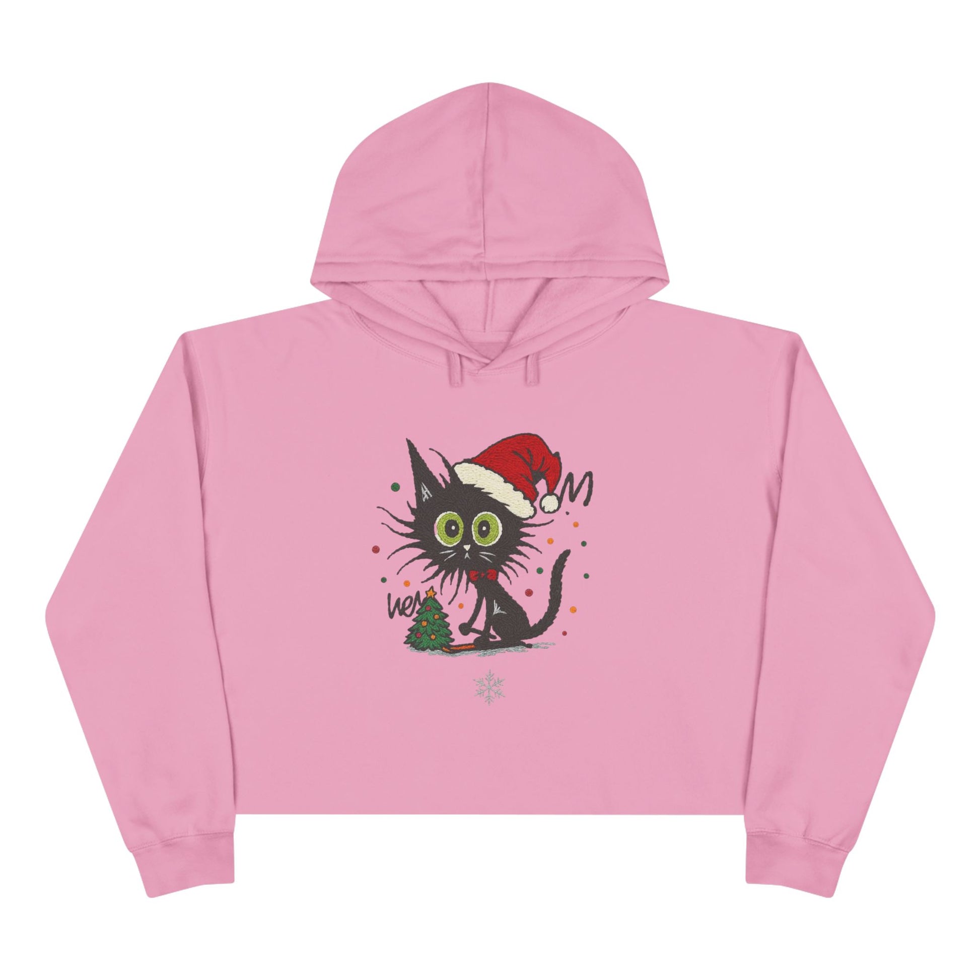 A cropped hoodie that brings playful holiday energy to chilly days. Soft, slightly fuzzy fabric hugs the shoulders while the dropped-sleeve silhouette keeps the look relaxed and easy. A wide, raw hem and cropped length show a flash of high-waist jeans or leggings, making it a cozy layer for quick errands, cocoa runs, or lounging by twinkling lights. The front art — a wide-eyed black cat in a Santa hat clutching a tiny tree — adds a cheeky, slightly spooky-meets-festive vibe that suits people who love seasonal whimsy with an edge. Wear it with oversized coats, chunky boots, or layered over a longline tee to keep movement and comfort first-rate during winter gatherings and casual holiday hangs.