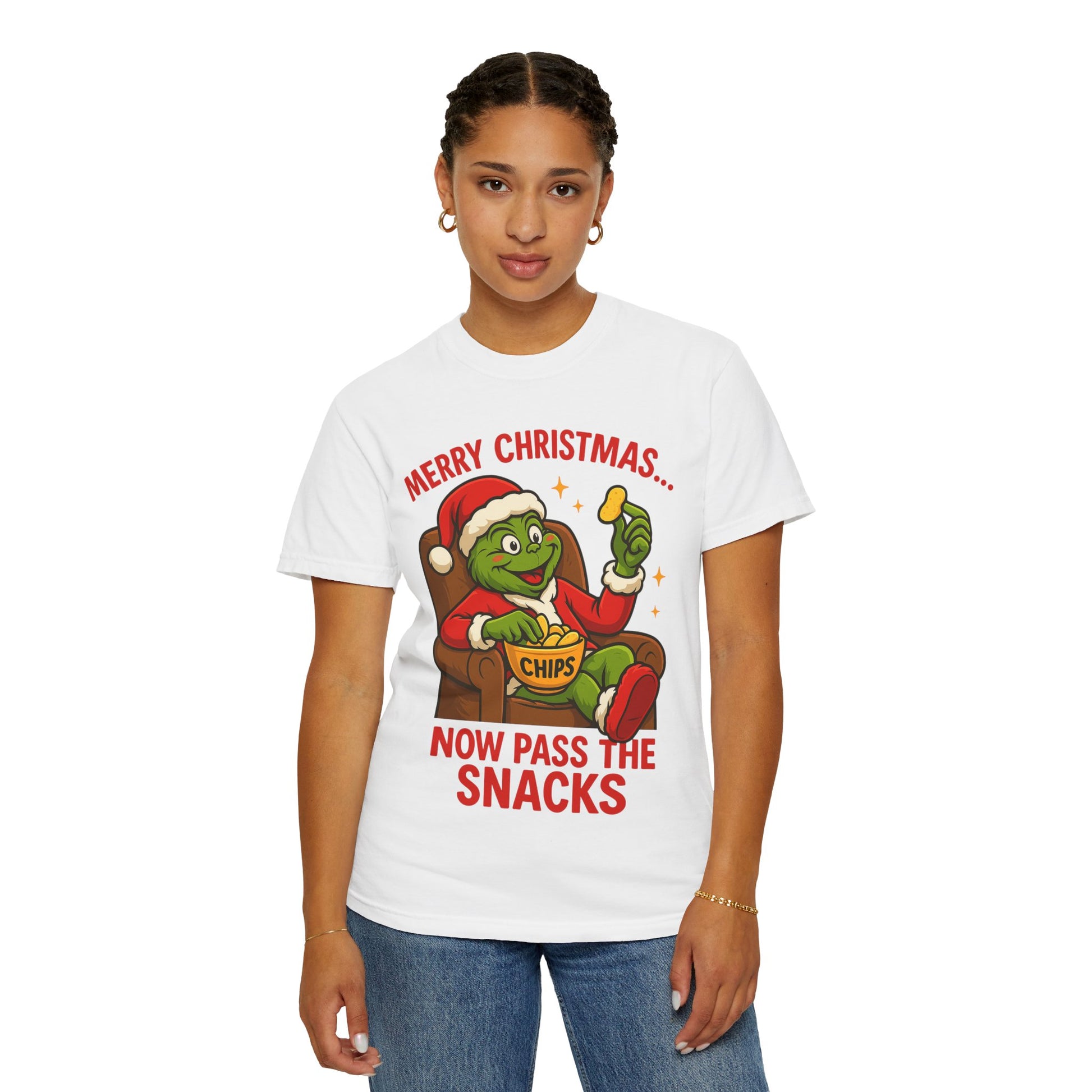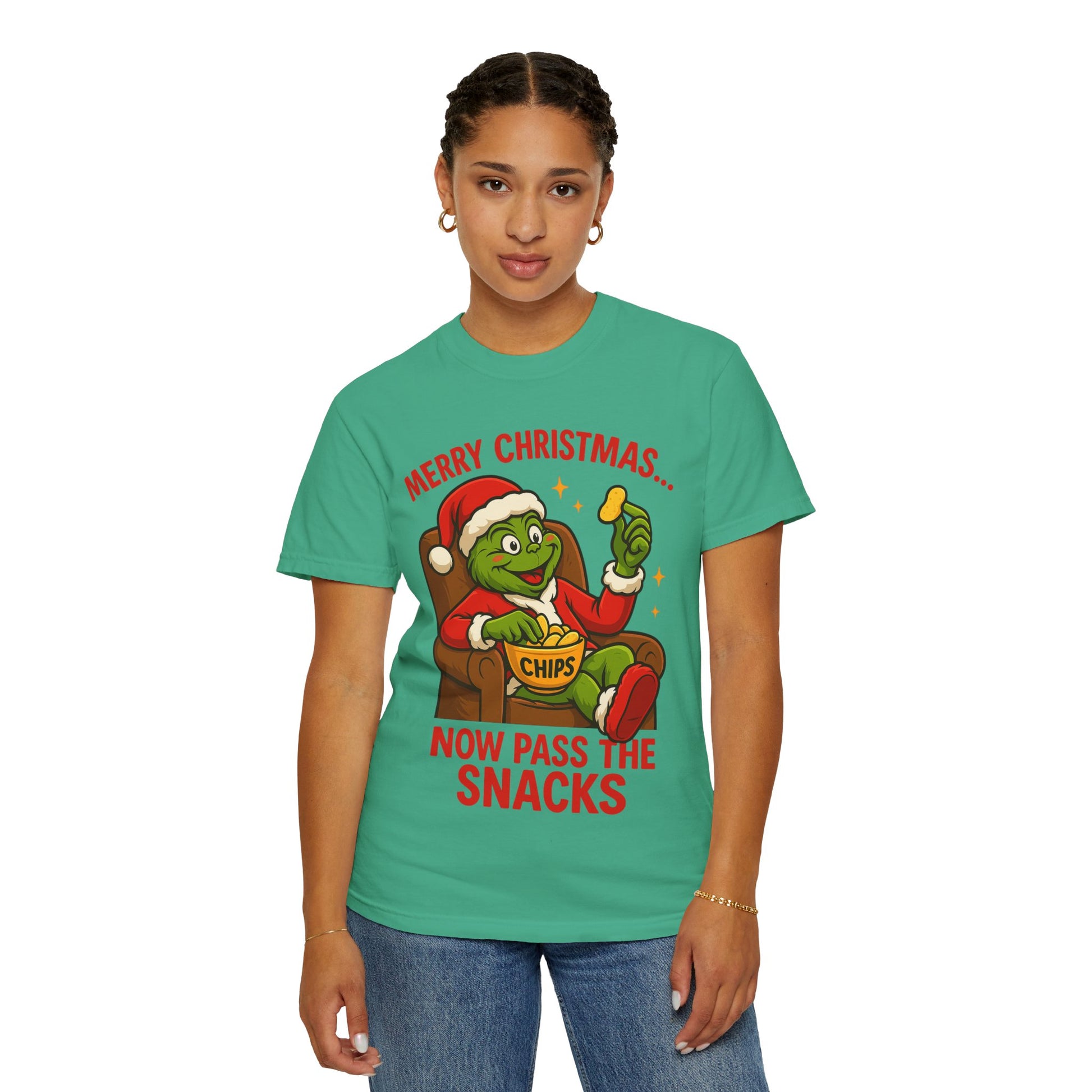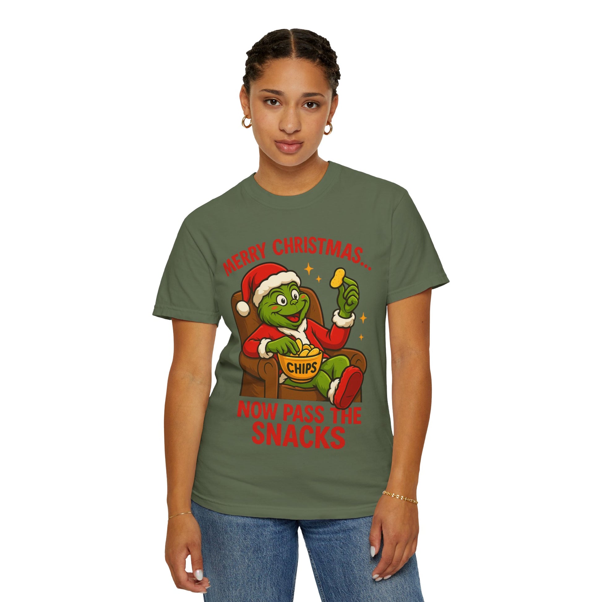 This relaxed garment-dyed tee brings a wink of holiday mischief to cozy nights in. A laid-back, vintage-style illustration — a cheeky green character in a Santa hat lounging with a bag of chips and the line “Merry Christmas... Now pass the snacks” — turns ordinary downtime into a laugh-out-loud moment. The medium-weight, 100% ring-spun cotton softens with wear and the after-construction dye gives the color a lived-in, worn-in feel. Cut with a relaxed fit and durable double-needle stitching, it sits comfortably through movie marathons, couch hangouts, and casual holiday gatherings. Choose from many colorways and sizes to match your vibe and let your seasonal humor do the talking.