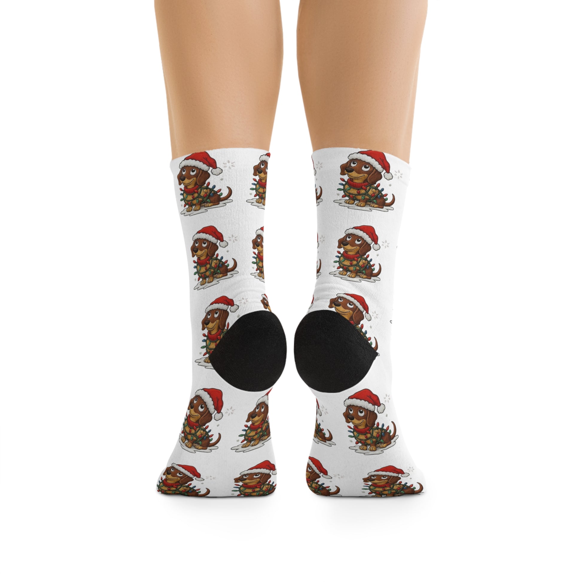 Slide into cozy, sustainably made socks that carry a cheeky holiday spirit. These mid-calf knit socks wrap your feet in a lively all-over print: a playful, Santa-hatted character repeated against a clean white field, with contrasting black heel and toe. The fabric has spring and structure from a high-quality 200-needle knit, feeling snug without squeezing. Because over half the blend is recycled polyester, these socks bring a lighter environmental footprint to everyday wear while keeping bright, full-color prints vivid from every angle. Expect a little color transfer on the first wash — treat them gently and the design stays joyful through many mornings of coffee, gift-wrapping, and strolling around festive get-togethers.