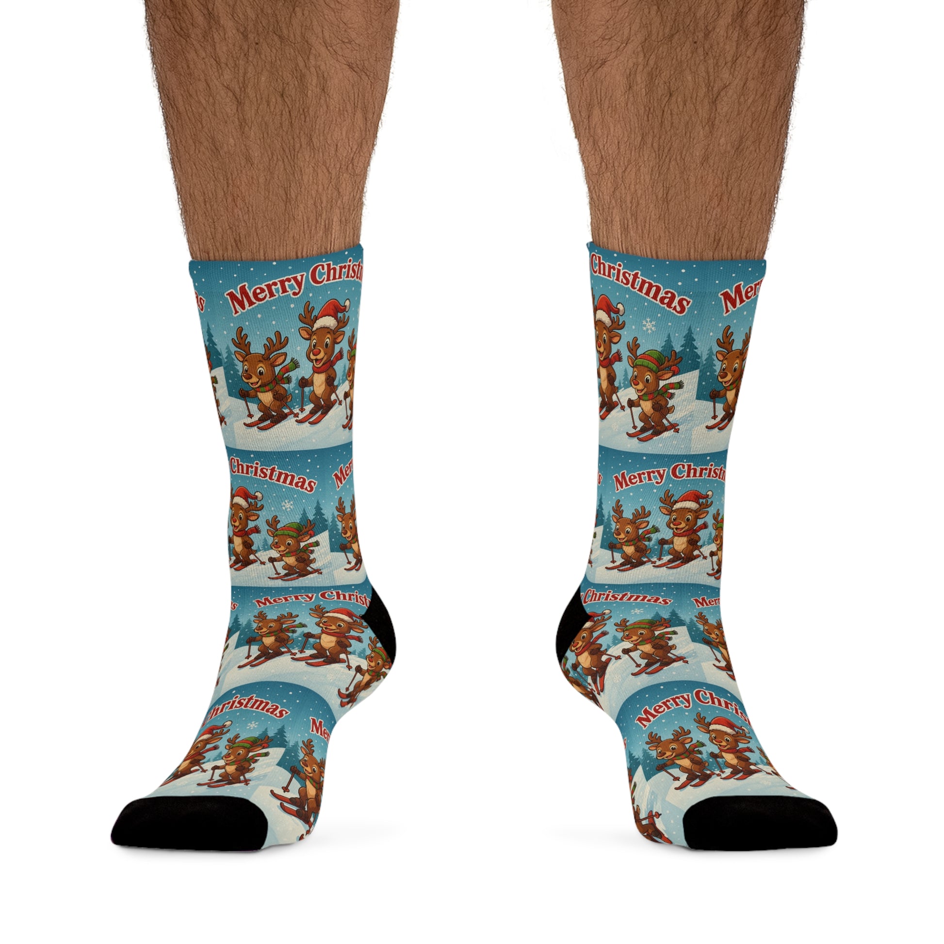 These lightweight, sustainably made socks bring nostalgic holiday cheer to every step. The all-over print wraps a vintage-style Christmas scene around the calf—carolers, snowy trees, and a soft sky—so your feet tell a story as you move. Knit with a dense 200-needle construction, they feel smooth against the skin while the blend of recycled polyester, nylon, cotton, and elastane keeps them stretchy and durable. They slip easily into cozy winter routines: curled up with cocoa, trimming the tree, or gifting a little merry surprise. Expect some initial color bleed on first wash; after that, the pattern stays bright and joyful.